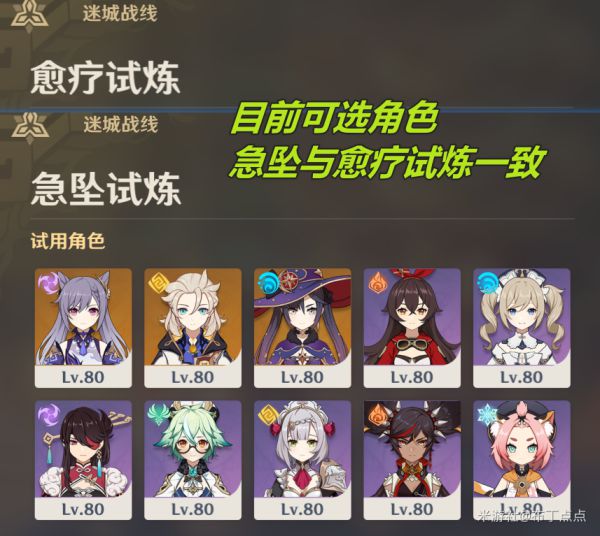 从5月21日刚开启的2个关卡【急坠试炼】和【愈疗试炼】来看,这个活动的难度,比扭曲领域要低;奖励总计420原石;直接试用心仪的80级五星角色才是真nice(注意:如果选择的角色你本已拥有,则会自动带上已拥有的命数上场,如果选的是新角色,则以0命上场)。