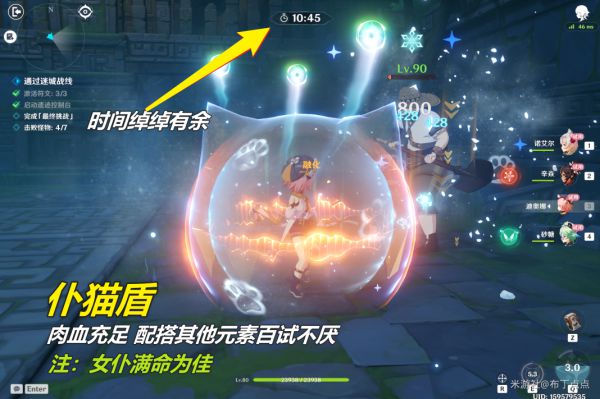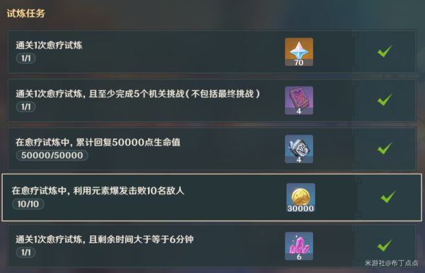 愈疗试炼真的很简单,基本上带着芭芭拉加个强力输出都能过,我满命女仆甚至可以只靠芭芭拉/莫娜破盾后站场无伤过(五星角色元素爆发砍倒10名敌人也是格外轻松),6~8分钟拿满奖励。