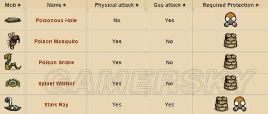 表第3竖列表示是否属于物理毒攻,第4竖列表示是否属于毒气攻击。最右为防御手段。