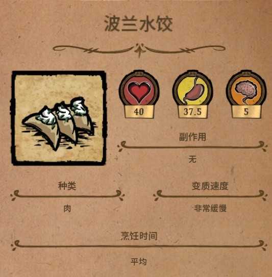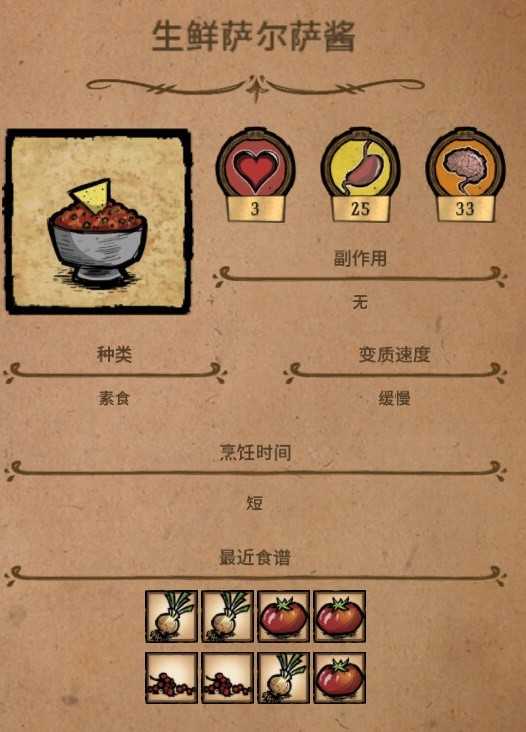 恢复饱食度的神器,在我快要饿死,手忙脚乱的时候我能第一时间想到的料理就只有它,在前期物资不是很丰富的时候,它可以说是最佳料理了,材料也很容易得到。缺点就是保质期比较短,易腐烂。