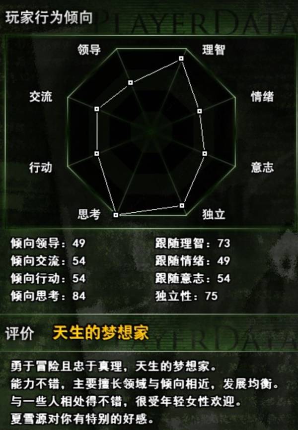 这个过程比较有趣的地方在于:会有一个类似于MBTI的性格测试结果,对于玩家的倾向领导、倾向交流、倾向行动、倾向思考、跟随理智、跟随情绪、跟随意志、独立性进行打分判断,最后得出一个综合的评价。
