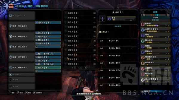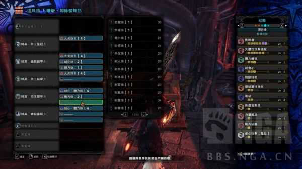 这里同样放出一个夹带上位炎王γ头的配装,防御力少了102点,但是插了体三,加猫饭200血正常情况都不会被秒杀,使用的话见仁见智。