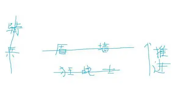 狂战士紧贴坚守在盾墙后方,开启线列或者散阵,敌方接近时会自动跑出盾墙迎战,需要注意的是,盾墙最好是拉成两排的纵深,狂战士线列和盾墙等长时此阵型的战斗力会被发挥到最大。