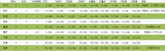 这是我总结的各兵种的属性图。可见,轻步损耗最低为0.5,战象损耗最高为3,重骑次之为2,重步为1.5。