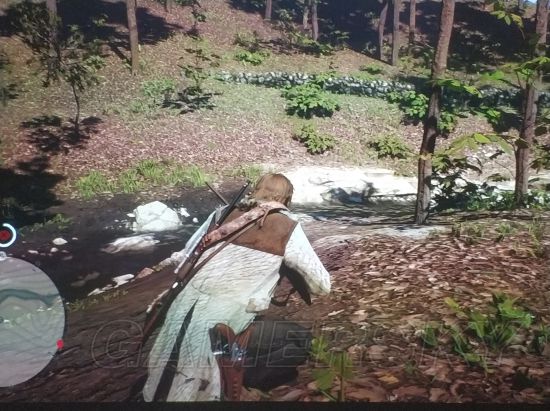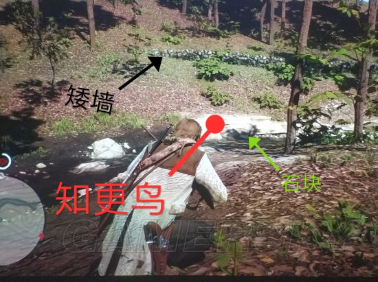 2.在图中位置可以看到岸边不远有个碎石堆的矮墙,溪边有块大石头,走到我图中的位置,蹲下。