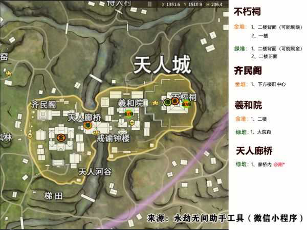 《永劫无间》中很多小伙伴对于天人城的构造及物资点的位置有点不清楚,那么现在为大家带来“墨子休”分享的《永劫无间》天人城金绿色物资点一览,希望对大家有所帮助。