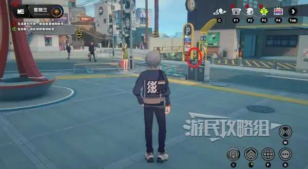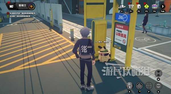 传送到光映广场步行区域,视角往左边的停车场转,在停车场的P牌子下方可以看到今天的邦布(邦布充电桩对面)。