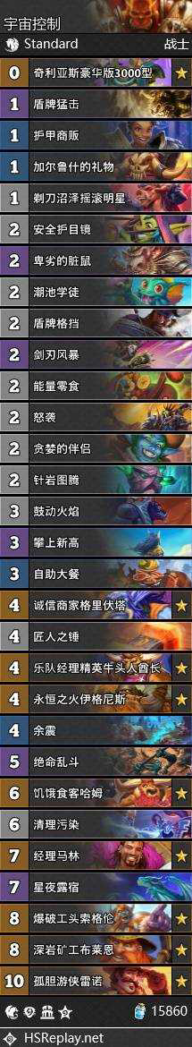 开发者备注:这是一副典型的慢速控制战士套牌,通过叠甲、解场法术和强大的后期卡牌来最终取得胜利。雷诺,还有布莱恩+爆破工头索格伦的组合可以说是超爽的制胜关键牌。此外,这副套牌还利用游客机制加入了德鲁伊的牌,可以获得额外的法力水晶。