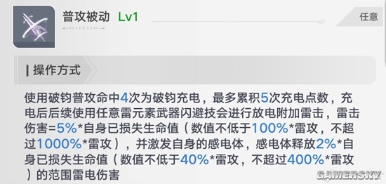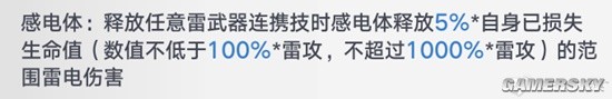 破钧的主动技能有很多的功能,除了基础的伤害能力之外,还有一个将敌方单位或者自己变成【感电体】的能力。【感电体】是一个能够产生额外雷伤的存在,他们会根据我们人物损失的生命值进行计算,产生额外的伤害。(破钧这把武器因为超导效果,会大幅度提升生命上限,又因为主动技能的被动,导致携带天琅的武器组每次在释放雷元素武器技能的时候,都会大幅度消耗人物血量,因而这个依靠损失生命值计算的额外伤害量不会很低)