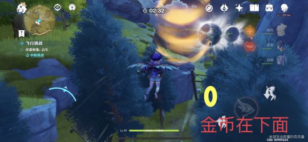 不要慌,既然无风,那就着陆吧。第3个金币在下面,视角问题,挡在树的后面。