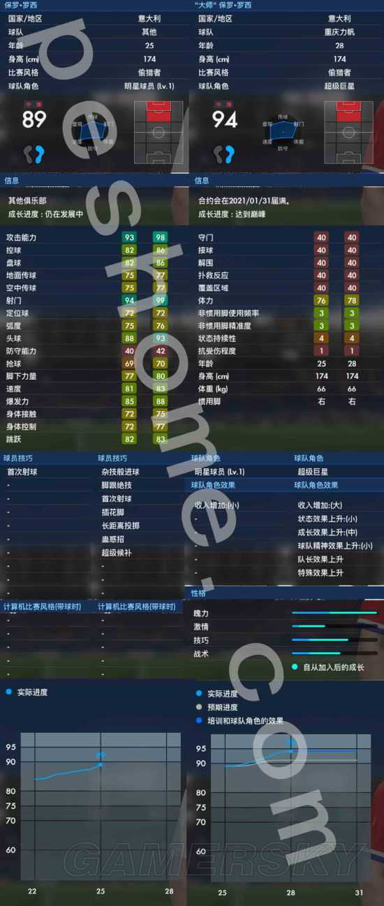 使用评价:保罗·罗西在历史上应该是因扎吉那样的机会主义型前锋,潜伏在对方的禁区中伺机发出致命一击。在pes2017大师联赛初期中,他确实是一个吃饼射手,但到了后期,保罗·罗西的发挥让我大吃一惊。这个存档中,我祭出3中锋阵型,另外两名中锋分别是里瓦和卡雷卡,里瓦可以走边,卡雷卡善于持球,结果到了后头完全是保罗·罗西又当爹又当妈的给这两位喂球,正好掉了个个儿。而且保罗·罗西自己拿球突破效果非常好,可以连过数人,传球质量也不错,最重要的是,一般机会主义型出身的中锋射门力量都比较小,保罗·罗西却有极长的射程,尤其是有助跑的远射,极具威胁,完全脱离了机会主义者这个范畴。