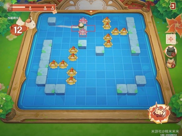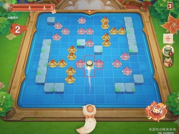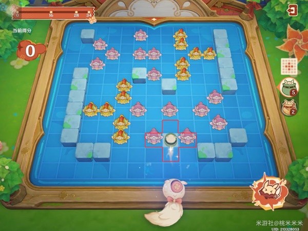 15.调整嘟嘟可至游戏盘右侧,从下数第五行,直接释放炸弹,炸弹碰到障碍自动爆炸。