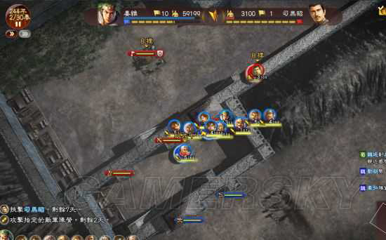 手合的时候,兵力很少的只有几百人那种的,就先放到本阵里面回复一下伤兵,其他人在城门口架井栏,和电脑决战。这一波防守并不难,可以轻松歼灭敌人,多用廖化的攻击指挥。
