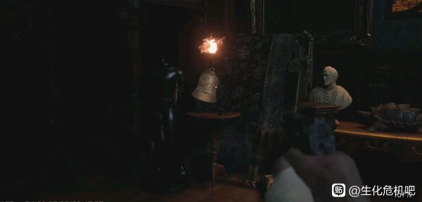 在有八尺大人画像的房间里,画板上写着“此时此地,五钟齐鸣”,就是把屋子里的五个钟(其实看着更想铃铛)全都打响即可,打响会起火。熟悉吗?正是6代里昂篇的第二章开头,里昂在教堂顶楼打响五个钟解密的那个环节!