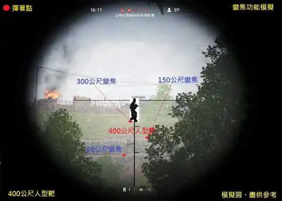 变焦功能、尽供参考、用图表示、经过距离的放大.弹着点会出现明显落差的模拟。