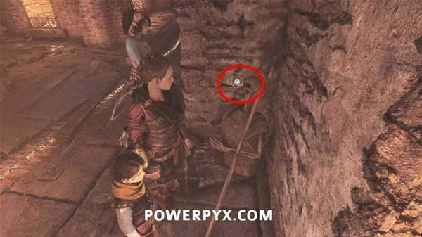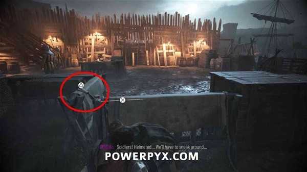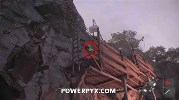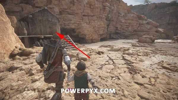 抬头往上看,用投石索打断铁链,将梯子放下来,然后一直爬梯子来到顶部,在小屋下的木桶上拿到短刀。