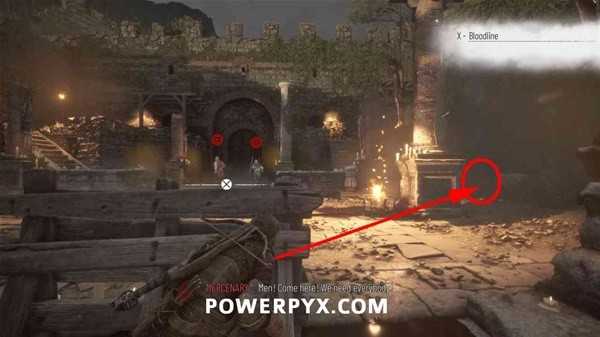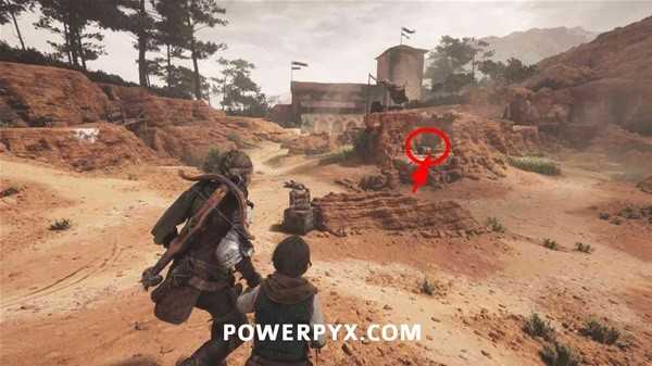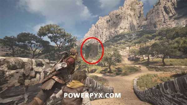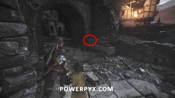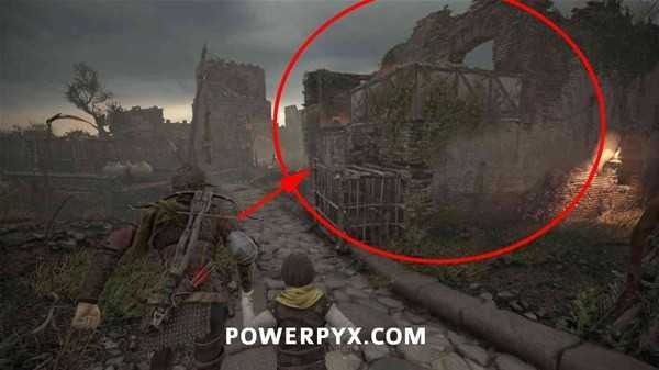朝着远处的双子山前进,过桥后前往左手边的塔楼(如下图),先从窗口处打断铁门的锁,然后进入塔楼,推开铁门在门后的木桶上拿到短刀。