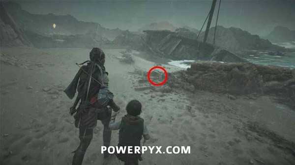 来到下边的海滩,沿着右边走,在船舶残骸前的岩石上拿到短刀。