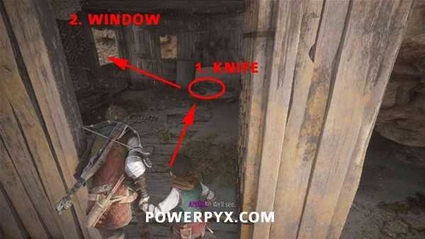 继续前进来到下一区域内有工作台的屋子,爬到上层后从左手边的阳台跳下去,左拐从木头上拿到短刀。
