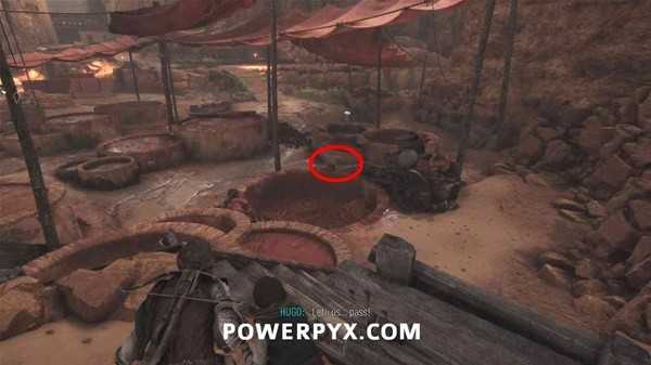 来到染料作坊室外,先控制老鼠离开池子,然后再捡池子边上的短刀。