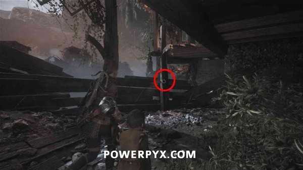 进入第二座小镇遭遇下一波敌人,沿着中间的路走,进入右侧第二栋建筑废墟(如下图所示),在1楼的桌子上拿到短刀。