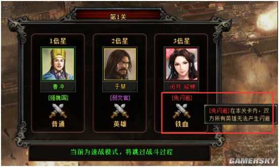 铁血闯关,大家不知道有没有注意到铁血闯关的说明?!对!就是如下图所示,每个铁血闯关都有不同的三个特性,大家需要根据这个特性合理的派遣将领和布阵,一些不能过或者不能三星的关卡就比较轻松了