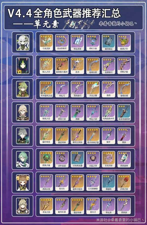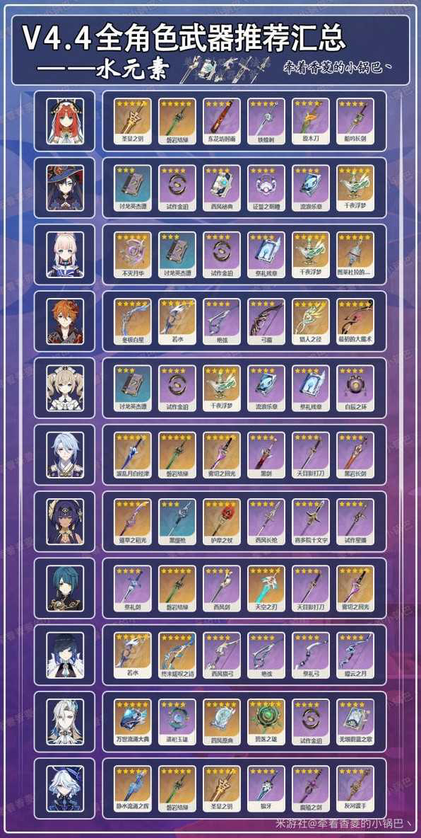 《原神》每个角色对于武器的属性需求不同,想要知道各个角色截止目前版本该如何选择武器的玩家请看下面“牵着香菱的小锅巴丶”带来的《原神》4.4版本全角色武器推荐,希望能够帮助大家。