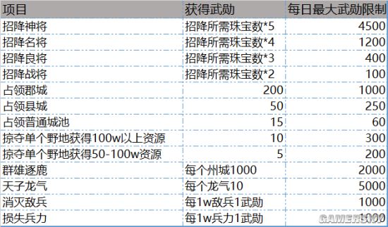 玩法:成功招降系统武将可以获得武勋;占领城池(占为己有)、掠夺野地(获得资源)可以获得武勋;每天群雄逐鹿结束时拥有州城可获得武勋;获得天子龙气同时可以获得武勋;杀敌可以获得武勋;损兵可以获得武勋;