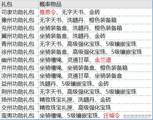 2.本服内每个州的州武勋排名第一名获得10个“*州功勋礼包”,第二名8个,第三名6个,第四名4个,第5名2个,第6-10名1个。同时前10名分别获得10、9……递减至1个橙色装备箱碎片。其余榜上有名者均可获得1个橙色装备箱碎片。每个州“*州功勋礼包”分别有几率开出随机10-50不等的礼金、各类普通或者高级Buff物品以及如下具有地域特色的特殊道具: