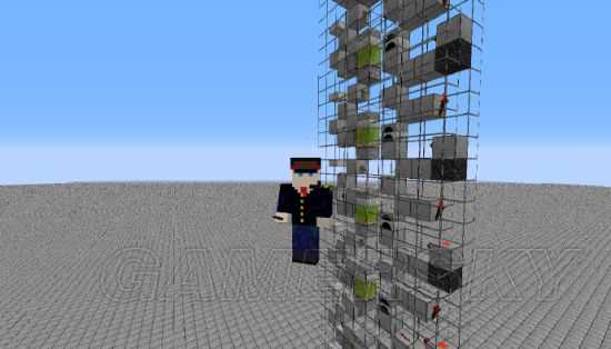 作品采用模块化结构,每个模块高5格,长9格,宽1格。可以在高度上任意数量叠加。主要材料只需要红石、粘性活塞、粘液块、中继器以及红石火把,还有熔炉或者别的活塞不能推动的方块。价格非常便宜,生存里施工材料方面压力并不大。