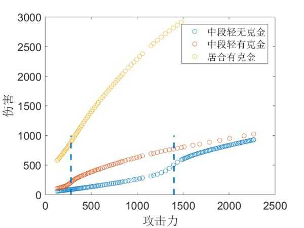 对于居合来说,这个高收益区域并不重要,比如同样对比有克金的情况,居合和中段轻的腾飞区域都在280左右(左边虚线),但是居合高收益区的每点提高2点多,以外也有1点多的伤害。