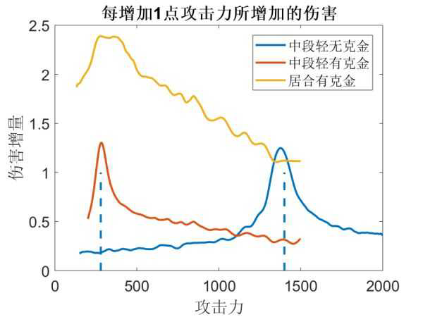 有一个很明显的特点是中间有一个区域是快速增长的阶段,在这个阶段以外增长都比较平缓,蓝色(无克金)和红色(有克金)非常明显。黄色(居合)不太明显但如果放大了看也是有的。这个快速增长的区域与敌人的防御力有关。无克金的情况下,这个区域在1400攻击前后,有克金情况下这个区域在280前后。不妨假设这个区域的中心就是敌人的防御力,不是也没有关系,重要的是这个区域的位置是由敌人防御力决定的,而敌人防御1400这个数字也是相对合理的。