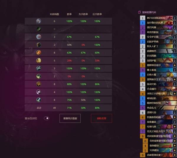 图上基本可以看到,dk、萨满、轮盘术都是大优对局,法师、猎人和战士内战属于小优,土灵骑劣势较大,亲王贼基本没法打。可以说在目前环境下优势对局还是很多的,绝对可以上分的一套牌。