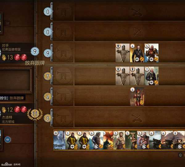 第二回合就是尽可能多的打出他的英雄牌和号角。杰洛特之类的,我们就可以弃权打第三回合。
