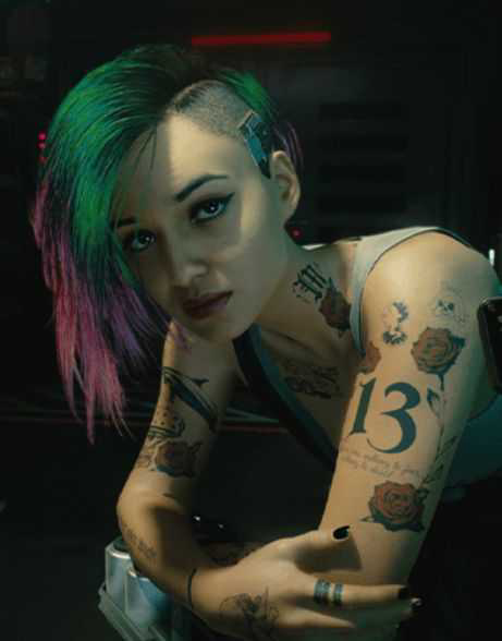 而朱迪,双亲早亡,儿时生活的地方被水淹了,在教堂的对话也可以看出小时候朱迪不能很好地面对自己的性取向,祖父母来了夜之城后几年就去了俄勒冈,这时候开始朱迪就只有一个人了,被非法丢进少管所(朱迪家电脑消息里),自学技术去了云顶,涉世不深暗恋前田舞子,认识了艾芙琳,发现了舞子的本质后对舞子彻底失望,加入莫克斯去了丽姿,想为那些底层的姑娘性偶们做些啥,后来发现莫克斯也就那样。