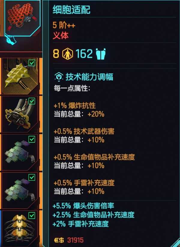 技术武器可以考虑带细胞适配(需要技术专长我本传奇),主要是为10%技术武器的伤害。如果有生存压力,可以考虑用反制壳层/疼痛编辑器替代。