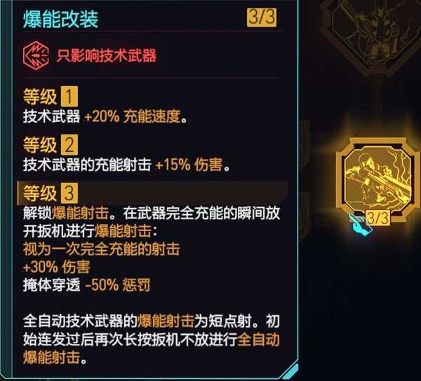 《赛博朋克2077》2.0更新后枪械流派整体弱势,不过技术武器和智能武器还是撑起了枪械流的强度。其中智能武器虽然是枪械流上限最高、操作门槛最低的流派,但是至少需要20智力并投入大量专长点数,以及5++军用科技平行线4型才能成型;而技术武器主要以武器本身为核心,和各流派都可以兼容,尤其适合不点智力的近战流派,伤害可观的同时可玩性也高,非常推荐喜欢玩枪械的玩家体验一下。