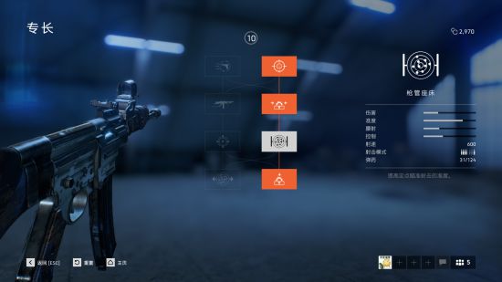 字面上意思就提高定点射击的精度,乍一看,好像是没啥卵用,因为战地5的运动战较多,远距离机枪基本也不是很需要这个专长,所以给人感觉这个是最弱的一个专长。但是事实上这个专长有隐藏属性,不知道是翻译问题,还是什么问题,这个专长会在你蹲下的时候减少武器后坐力,武器晃动。这样对很多带一倍瞄准镜的武器有的质的提升,为什么这么说呢?