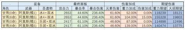 考虑到由于敌人不总是在冰冻状态下,对冰4甘雨的蓄力射击,只计算了55%的暴击加成,大招伤害也只计算了35%的暴击加成,均不考虑冻结状态。