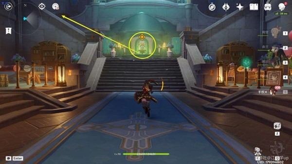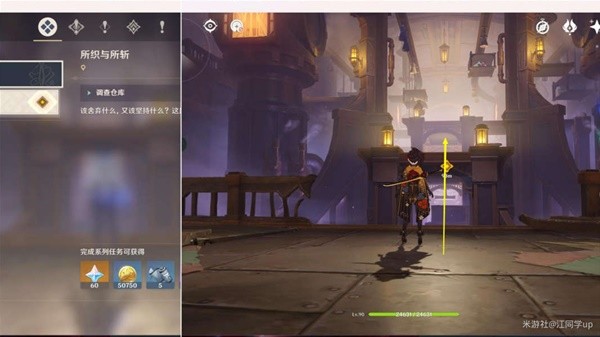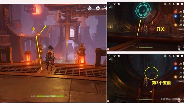 (8)继续追踪任务来到最后下图位置,利用【千织】的E技能和电梯一直上到最上面,打开上面开关后,门里面就是第3个【珍贵宝箱】,然后从宝箱前面进入水下后,随波逐流就会出副本了