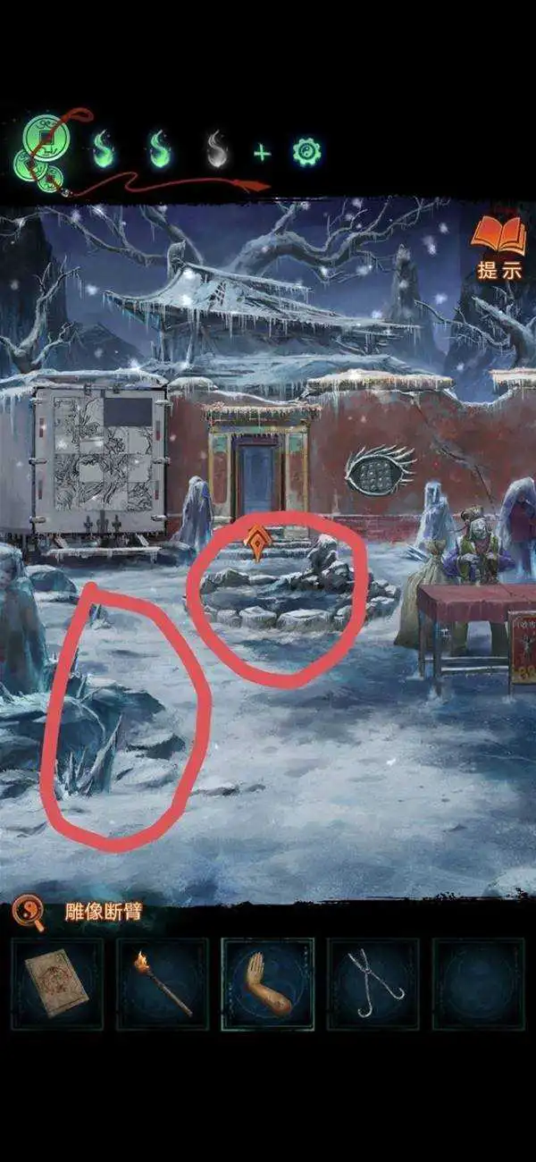 切换场景拾取地上道具雕像断臂,切换雪天场景纸人拾取道具大夹子,水池用火把烧破冰层(注意有高能,害怕的请准备好),用大夹子夹取道具戒尺