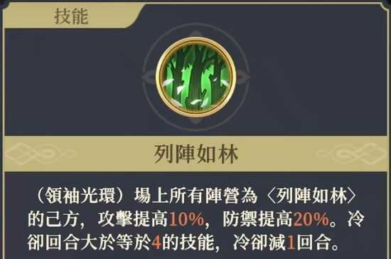 第七阶技能推荐选择列阵如林,列阵如林为阵营光环,列阵如林阵营的己方提高攻击与防御,同时冷却回合大于4的技能,可以减少1回合冷却。
