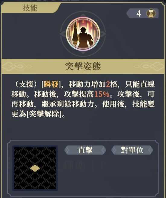 第三阶技能推荐选择突袭姿态,因为列奥尼德的技能随着移动距离的增加而增加,突袭姿态能够为角色多提供2格的移动距离,提升了列奥尼德的伤害。