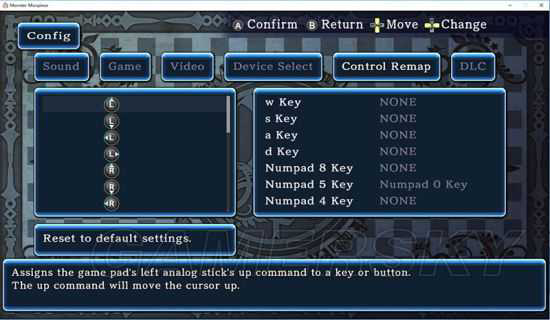操作方面因为是移植作品,虽然大部分鼠标就能搞定但后面部分操作上可能会有些许不便,有条件的可以用手柄游玩,config(设置)里“Device Select”和“Control Remap”是关于操作的设置,攻略里涉及到键位的都是手柄键位