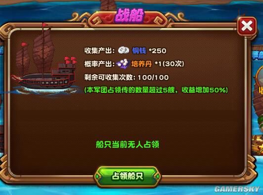 (温馨提示:同军团里占领船只数超过5艘,收益增加50%,赶紧叫上军团的小伙伴一起抢船。)