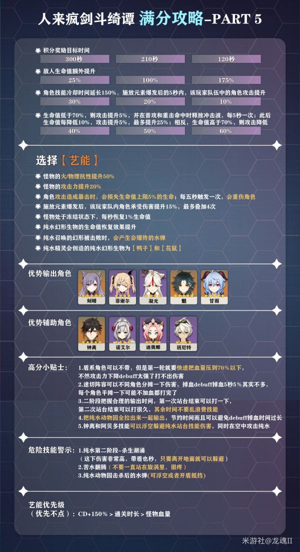 今天第五期其实也没有太难的,因为没有了阴间的强力削血debuff,现在的削血debuff效果很弱基本感觉不到,带盾或者不带盾都行,只要不被动物园秒了都行,纯水也打不到人的。整体过关是不难的。但是要满分还是有点不太容易。因为CD+150%,还有开局70%血以上降攻击力,加上纯水乱跑,需要赶紧下降血量至70%以下,然后用以普攻为主要输出又有爆发的角色输出,而且火抗+50%火属性的角色基本废掉,打过不难,就是满分时间有点紧。其他要点和第二天基本一样。