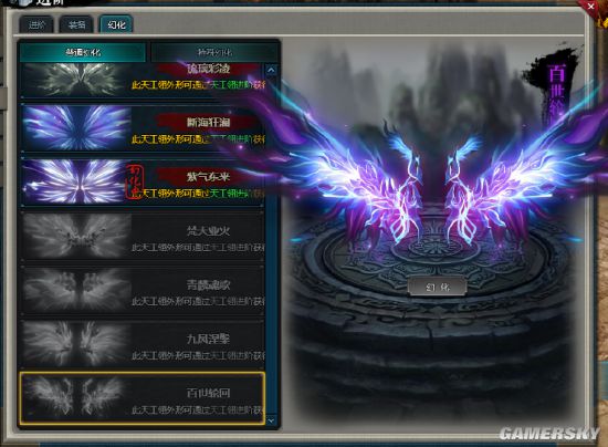 玩家可通过幻化界面对不同阶数的外形进行预览,并且当玩家翅膀达到该阶数后,可对比现有阶数的翅膀进行外形幻化,比现有阶数较高的翅膀外形则需要在达到该阶数后才能获得该阶翅膀外形幻化。翅膀特殊幻化属性固定,通过特殊活动获得。