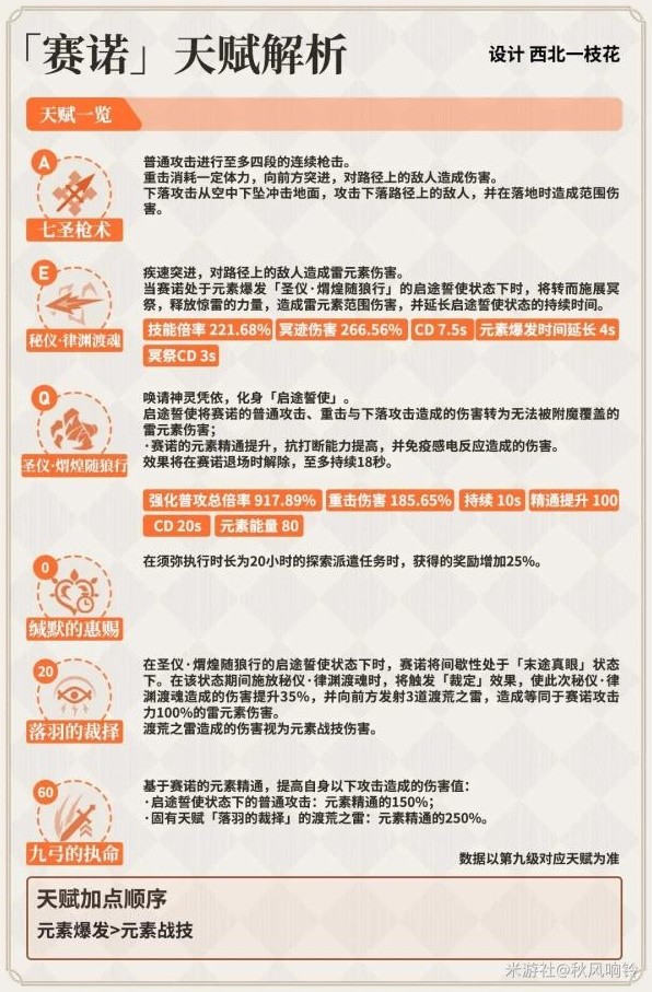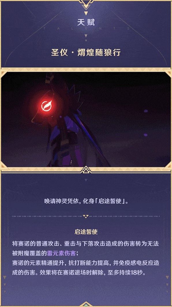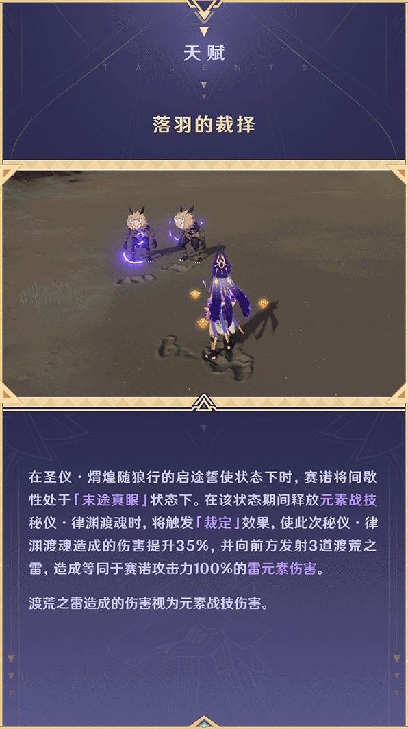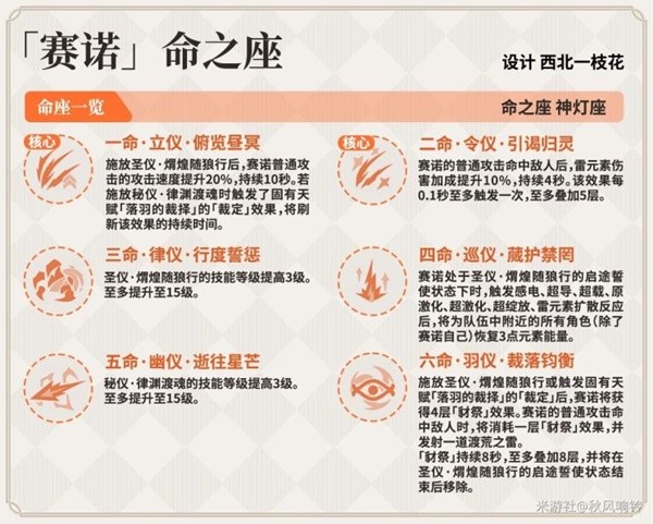 赛诺以元素爆发提供附魔能力/提升输出,靠元素战技辅助性输出,其设定与魈类似(但元素爆发转化不同于魈的提高普攻伤害)