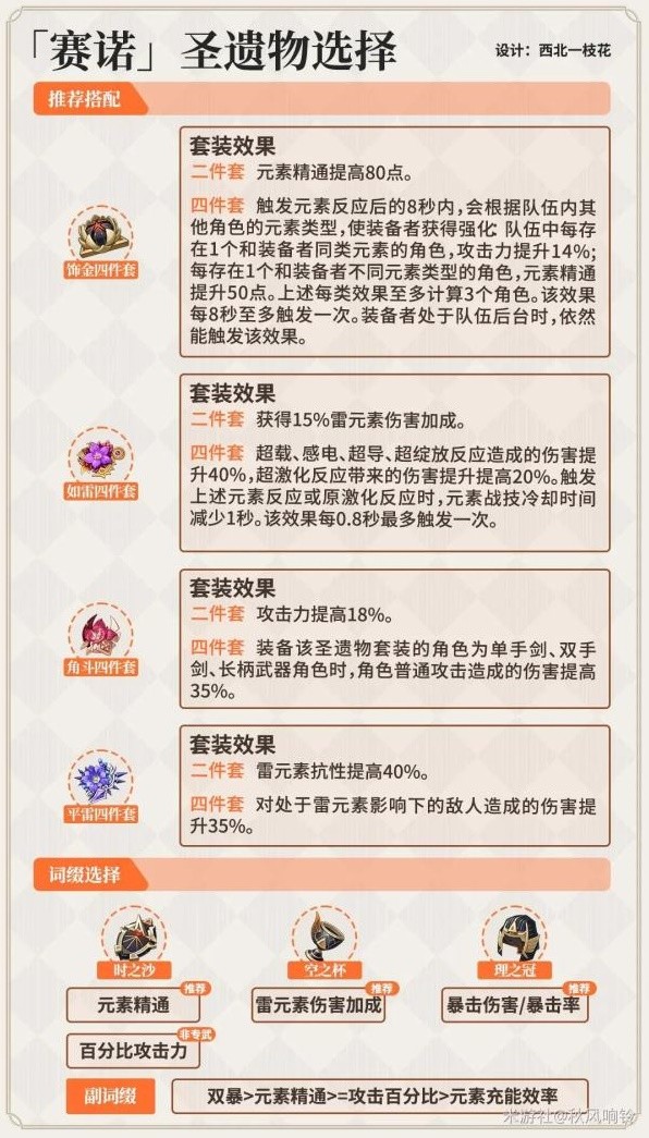 高基础攻击力之外,武器加成赛诺基本能吃满,圣遗物可以更加关注精通和双爆。