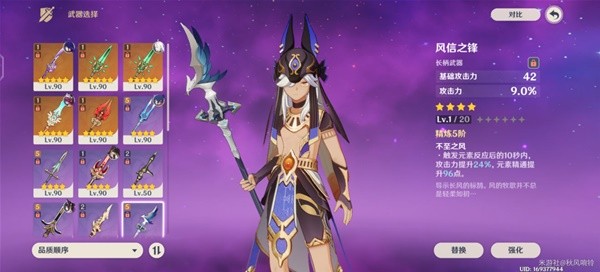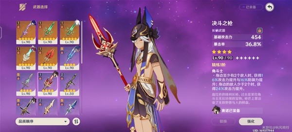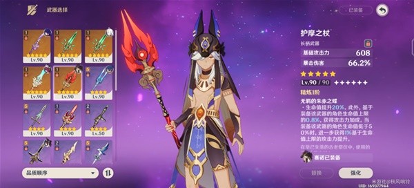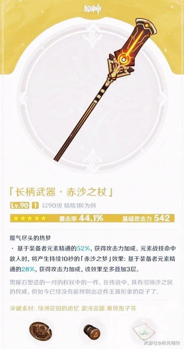 专武赤沙之杖自然是首选,精炼1就能使精通140%转化为攻击力提高,在圣遗物就可以无脑堆精通了。